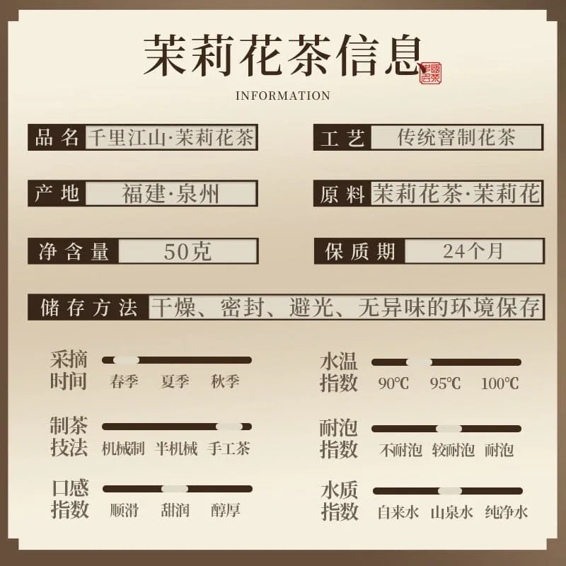 The standard brewing method for jasmine tea is: water temperature of 80-90 ℃, tea dosage of 3-5 grams/200 milliliters, first steeping time of 1-3 minutes, followed by an extension of 10-20 seconds for each subsequent steeping, and can be brewed 3-4 times.