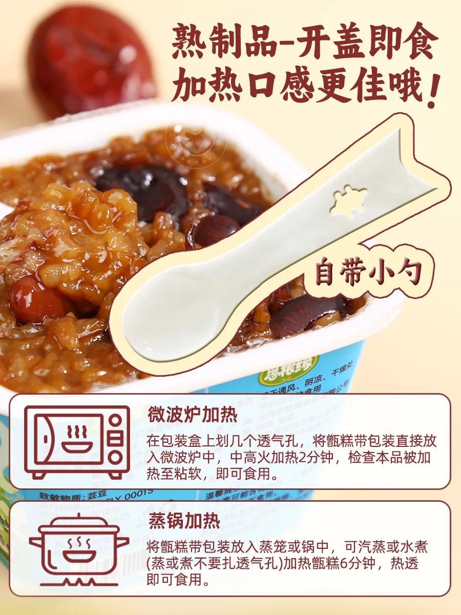 Cut a few air holes on the packaging box, put the steamed cake package directly into the microwave oven, heat it for 2 minutes on medium and high heat, and check that the product is heated until it is sticky and soft, and then it can be eaten.