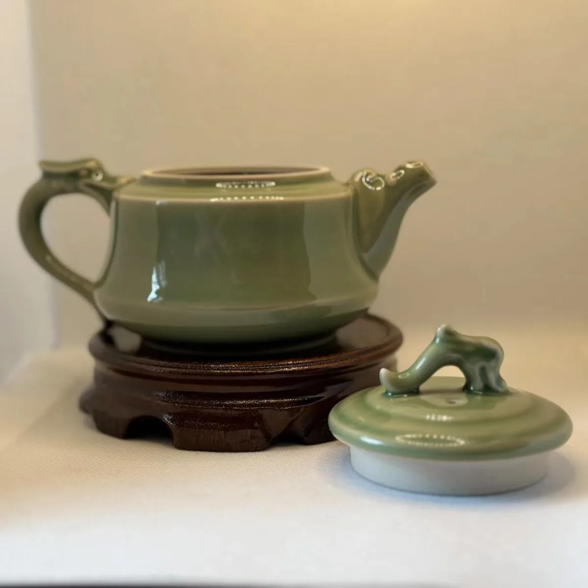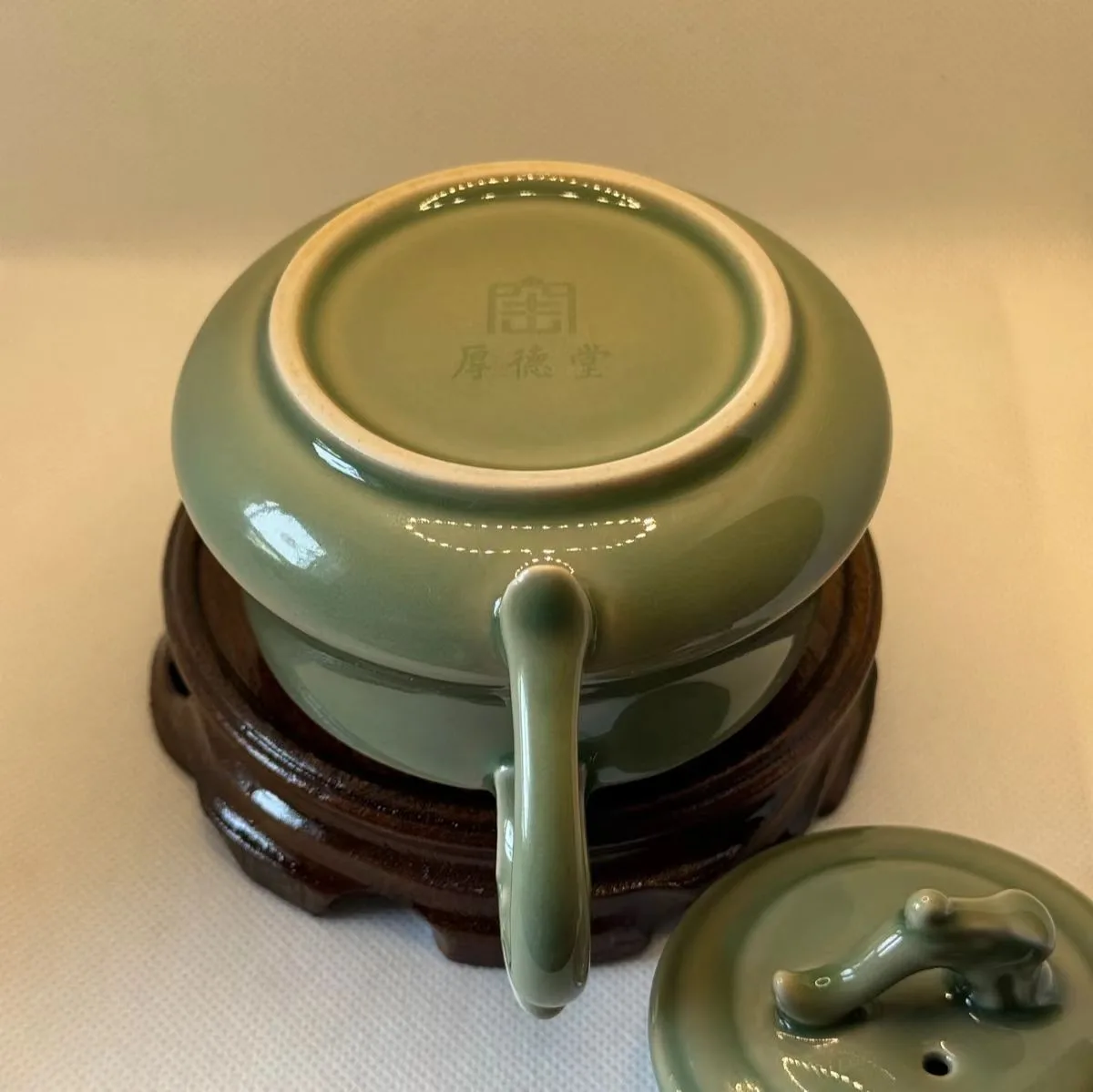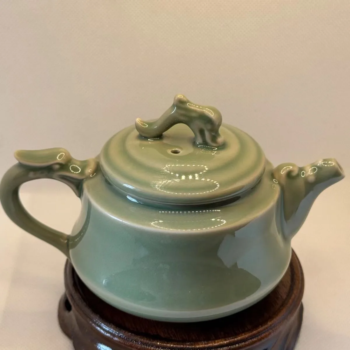 The Ming Yaozhou Kiln Blue Glazed Teapot is a ceramic tea set fired by the Ming Yaozhou Kiln. Yaozhou Kiln porcelain reached its peak during the Five Dynasties and Two Song Dynasties, and continued to be produced during the Ming Dynasty. This blue glazed teapot is a product of that period. The object has a regular shape. The emergence of teapot shapes is related to the popularity of loose tea brewing methods in the Ming Dynasty, and the production of such utensils reflects the changes in tea drinking customs at that time. The main prosperous period of Yaozhou kiln was during the Five Dynasties and Two Song Dynasties, and production still existed in the Ming Dynasty. This celadon teapot should be a masterpiece of Yaozhou kiln products from the Ming Dynasty, with a regular shape and extraordinary aura.