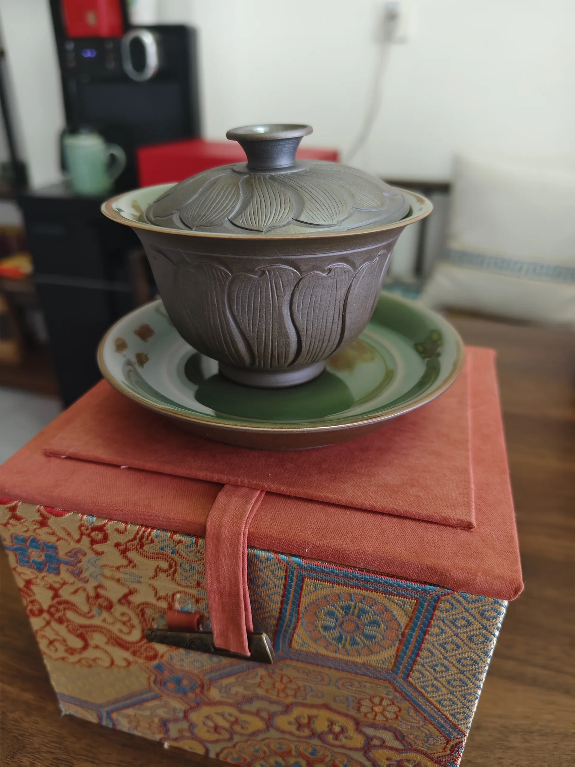 This lidded bowl continues the Yaozhou kiln’s reputation as the “crown of carved celadon.” Each piece carries the artisan’s handmade imprint—whether it is a slight twist of a petal or the varying depth of a leaf vein, no two are alike. Just like the tea bowls used for “tea competitions” in the Song dynasty, it is both a practical tea vessel and a refined object embodying the philosophy of “harmony between heaven and man,” making it ideal for tea enthusiasts who seek the coexistence of utensils and life.